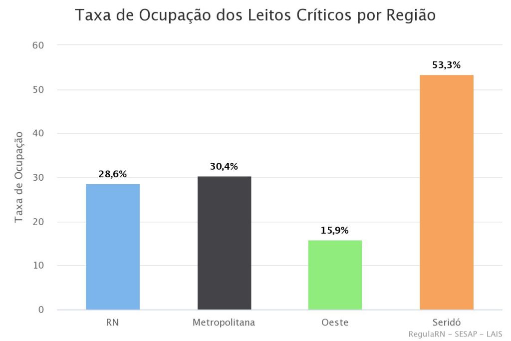 Segundo a Sesap, a Região metropolitana apresenta 30,4% dos leitos críticos ocupados, a região Oeste tem 15,9% e a Região Seridó tem 53,3%.