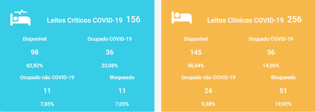 Até o momento desta publicação são 98 leitos críticos (UTI) disponíveis e 36 ocupados, enquanto em relação aos leitos clínicos (enfermaria), são 145 disponíveis e 36 ocupados.